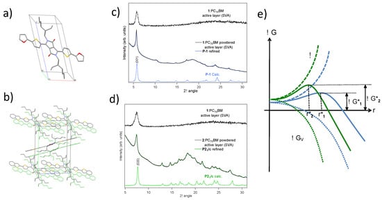 (a,b) X-ray crystal structures of molecules 1 and 2, showing the unit cells; (c,d) Stacked diffractograms of active layers, “powdered” active layer diffractogram and superimposed refined diffractogram from the X-ray single-crystal structure, and calculated diffractogram (at 100 K) from the X-ray single-crystal structure of 1 and 2 shown in (a,b); (e) hypothetical energetic profile of donors’ nucleation in active layers of derivatives 1 and 2. Adapted with permission from Wiley VCH, copyright 2017 [].