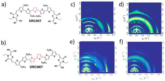(a,b) Chemical structures of DRCN5T and DRCN6T; (c,e) GIXD patterns of pure films of DRCN5T and DRCN6T, respectively; (d,f), GIXD patterns of blend films of DRCN5T:PC71BM and DRCN6T:PC71BM, respectively. Adapted with permission from the American Chemical Society, copyright 2019 [].