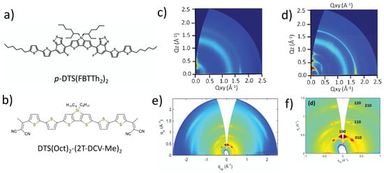 (a,b) Chemical structures of p-DTS(FBTTh2)2 and DTS(Oct)2-(2T-DCV-Me)2; (c,d) GIWAXS patterns of pristine DTS(FBTTh2)2 films and DTS(FBTTh2)2:PC70BM films; (e,f) GIWAXS pattern of DTS(Oct)2-(2T-DCV-Me)2:PC70BM films. Adapted with permission from Wiley VCH, copyright 2014 and 2015 [,].