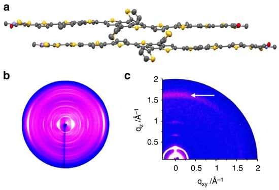 (a) X-ray diffraction single crystal structure of BTR, with the alkyl side chains omitted for clarity; (b) 2D-WAXS of BTR filament measured at 30 °C; (c) GIWAXS of spin-cast BTR thin film on silicon (p-stacking reflection is indicated by an arrow). Adapted with permission from the Nature Publishing Group, copyright 2015 [].