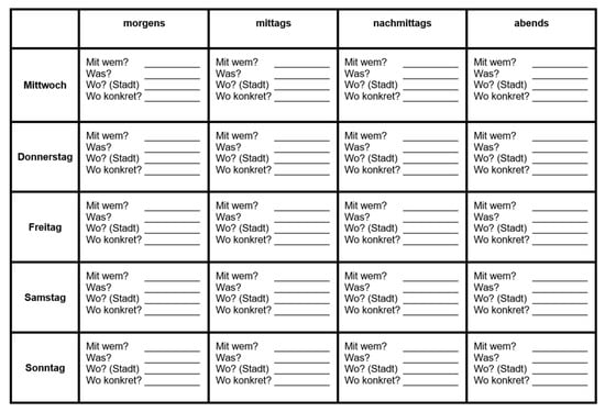 In both the digital as well as the paper versions, the agenda was divided into five days (Wednesday to Sunday) and four time slots (morning, noon, afternoon, night) so that students could indicate in each time frame the following information: (1) the kind of activity they want to do, (2) the person with whom they intend to do the activity and (3) the place/city and time at which they intend to do the activity.