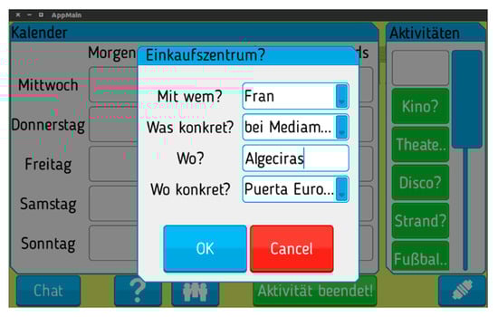 - Iterative cycle of planning–action–reflection: in the first iteration (before developing the digital version of Terminkalender), students’ conversations on paper had to be digitized by hand for its posterior analysis. Moreover, the continuous exchange of messages on paper during the implementation of this learning task did not yield a fluid interaction and communication amongst students, leaving messages from peers sometimes unattended. This led to the planning of a second iteration and the final design of the first digital version (app) of Terminkalender. The idea was to facilitate (1) the accomplishment of the learning task and (2) its posterior analysis, thanks to the exchange of instant messaging and the automatic registration of all the information generated on the server. In subsequent iterations, this first version of the app was refined.