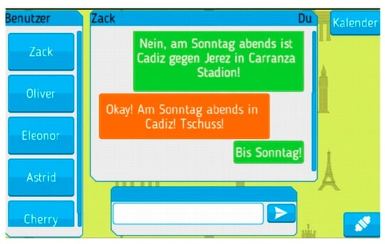 To arrange the respective appointments, those students who used the digital version (ExpGr) were provided with a chat-function (integrated into the same app) that allowed them to interact with the other members of their group (members were randomly assigned by the students’ language teacher). Students’ identities were previously anonymized by the system itself using random names so that they could not communicate by any other means than the integrated chat function (Figure 5).