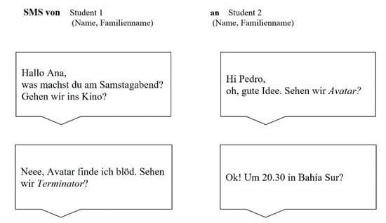 Considering that Terminkalender required students to negotiate and agree amongst peers on a series of activities to be carried out jointly (expressing preferences, disagreements or even the lack of availability regarding a certain activity, place or time slot), the analysis especially focused on linguistic aspects such as the following: the correct use of adjectives and adverbs, personal pronouns, local, temporal and conceptual prepositions that are used in combination with personal pronouns (e.g., mit mir, mit uns, etc.); the use of interjections and idiomatic expressions (e.g., Neee!, Keine Ahnung!, Tut mir leid!, Alles klar!, Cool!, Perfekt!, etc.); and finally, the type and complexity of the structures used (sentences and questions with a single word, sentences and more complex questions).