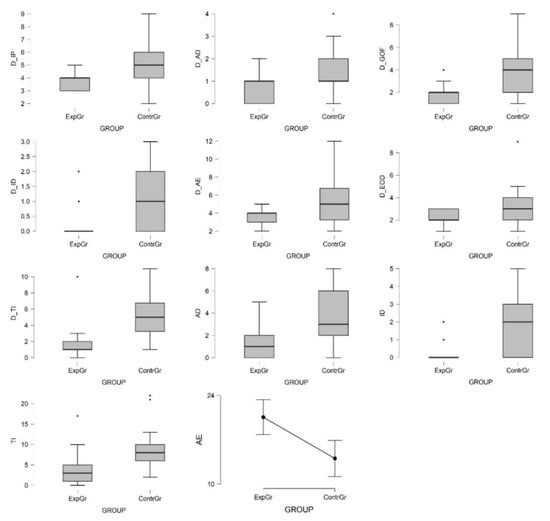To determine if there is a statistically significant difference between the means of the two groups (ContrGr and ExpGr) the parametric independent Student’s t-test was used. Given the size of the groups (n1 = 22; n2 = 21), the normality of the dependent variables was checked using the Shapiro–Wilk test. The Levene’s test was applied to test the equality of variances. An adjusted t-statistic based on the Welch method was used when the group variances were unequal.