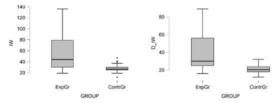 Concerning the correct language use (Figure 9), the Mann–Whitney test indicated that the number of incorrect words (IW) and the diversity of incorrect words (D_IW) was significantly higher for the ExpGr than for the ContrGr.