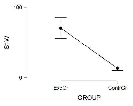 Concerning the complexity of the sentences used, based on the number of words employed, there were statistically significant differences between both groups (Figure 10). An independent t-test showed that the number of sentences of a single word (S1W) was much higher for the ExpGr than for the ContrGr. Hedges’ g suggests that this is a huge effect. Levene’s test indicated unequal variances (F = 21.88, p < 0.001), so degrees of freedom were adjusted from 41 to 22.