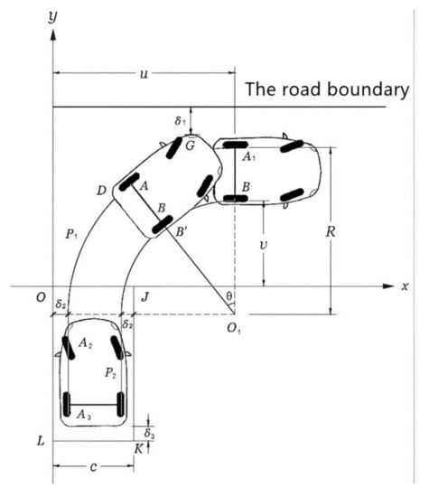 - According to the provisions of “Code for Garage Building Design JGJ 100–2015”, after the vehicle enters the parking space and the car body is aligned at 90°, it keeps a safe distance from the size line of the parking space. Therefore, to determine whether this spatial constraint condition is satisfied, it should be considered that O1D does not touch the track in the X direction of the boundary dimension line when the vehicle steering angle reaches θ, namely:
