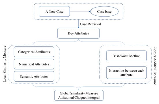 When a new case appears, a CBR system begins with case retrieval. First, key attributes are extracted to represent the case. Generally, attribute data can be divided into several types. In this study, we propose different similarity measures for three types of attribute data. In addition, for an accurate CBR system, the weights of individual attributes and the interaction between attributes should be considered. Many previous studies calculated the weight of attributes using an average operator or weighted average operator, which may lead to a significant difference between the calculated weights and the actual weights. However, the attribute weights are not the same in most cases. In some cases, attributes are not independent of each other, and the interaction between attributes is too important to ignore. Therefore, the joint weights of multiple attributes are not always the sum of the weights of each attribute. We adopt a 2-order additive measure to elaborate on all interactions between attributes. Furthermore, considering the influence of the decision maker’s attitude, the ACI was used to obtain the global similarity between the two cases. The framework of the proposed CBR system is shown in Figure 1 and elaborated below.