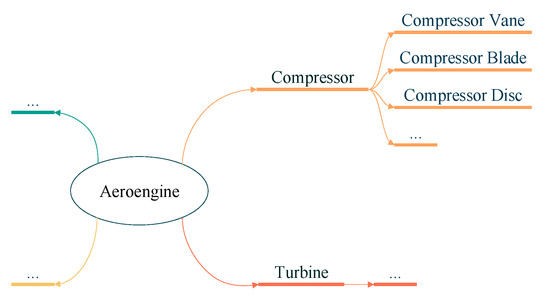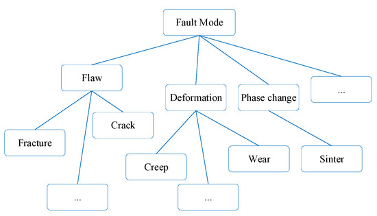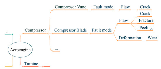 The semantic similarity based on tree is used to measure the semantic attribute similarity of the aeroengine fault part and fault mode, which defines the association of the fault mode with the fault part. It consists of two elements: tree structure of the fault part and semantic diagram of the fault mode. Figure 2 shows a schematic diagram of the fault part tree structure of an aeroengine, wherein parts are differentiated and structured to calculate their similarities under the same or different fault modes. Further, a fault mode semantic diagram is developed, as shown in Figure 3. Finally, the association of fault mode with fault part is defined by combining the fault part tree structure and the fault mode semantic diagram, as shown in Figure 4.