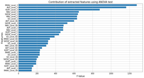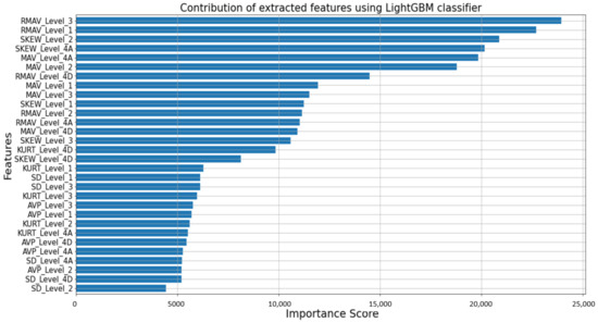 We analyzed the involved features to understand the importance of the features extracted by DTCWT. We used two feature analysis methods: filtering using ANOVA (analysis of variance) and LightGBM feature importance scores. In both techniques, selecting the top important features, such as 5, 10, or 20 top features, always led to a decrease in classification results regardless of the choice of the number of selected features. Figure 4 and Figure 5 present the results of features obtained by DTCWT using ANOVA and LightGBM feature importance, respectively. We analyzed the extracted features channel-wise and presented the average of all those channels’ features. It can be observed from the presented results that all extracted features by DTCWT in our technique play important roles in improving the performance of classification. Therefore, we used all the features, as we believe all features contribute to improving the classification results.