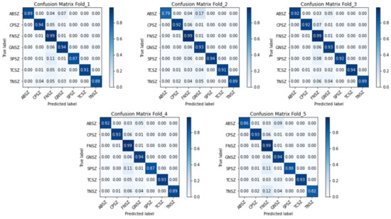 It can be observed from Table 1 that in TUSZ, there are six specific types of seizures and two non-specific general types. From a pathological point of view, these types are not completely disjoint but form a hierarchical sub-grouping [4,26]. It has been stated in [7] that when there is inadequate evidence to label the type of seizure confidently, the corpus team tends to label an event as either focal non-specific or generalized non-specific based on the seizure’s focality and locality [25]. Both of these types are not medically distinct from one another, whereas SPNS and CPSZ are more specific types of FNSZ, and ABSZ, TNSZ, TNSZ, and MYSZ are more specific types of GNSZ [4,26]. Thus, considering the label FNSZ as a unique type of seizure against the specific focal types CPSZ and SPSZ might cause the classifier not to perform well, and similarly for the classification of GNSZ.