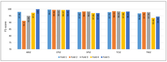 For both classification problems, we performed a five-fold cross-validation. For a seven-class problem, our proposed technique achieved a weighted average F1-score of 96.04%. Figure 6 presents the classification performance in terms of F1-score for each class in the dataset for all five folds, while Figure 7 presents the confusion matrix for our proposed technique’s performance on the seven-class classification problem.