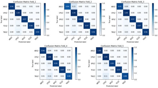 Confusion matrix for 5-class classification problem having 5-fold cross-validation: 1st to 5th fold (left to right, top to bottom).
