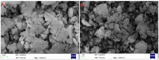 Figure 2 shows that MMt has larger plates with a platy structure, while Al13-O-MMt has smaller aggregated plates with small particles, indicating that the modifications by the Keggin Al13 complex and HDTMA caused the changes in particle size and even morphology, which might have improved the ability to adsorb pollutants.