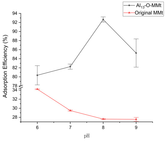 Figure 3 shows that the adsorption efficiency of Al13-O-MMt is higher than MMt in the pH range of 6–9. Phosphate is a form of phosphorus in aqueous solution, which has a negative charge. Modifiers occupying the negatively charged sites of MMt can reduce the electrostatic repulsion between the phosphate and adsorbent, resulting in an increase in the adsorption efficiency of Al13-O-MMt. In addition, the Lewis acidity sites from the Keggin Al13 complex can attract substances with a negative charge [,,]. Therefore, the adsorption efficiency of phosphorus onto Al13-O-MMt is better than that onto MMt. Figure 3 indicates that the pH has an effect on the efficiency of the adsorption of phosphorus onto both Al13-O-MMt and MMt. The efficiency of the adsorption of phosphorus onto Al13-O-MMt increased from pH 6 to 8. This is because the concentration of OH− increases with the increase in pH in the range of 6 to 8, causing HPO4− to transform into PO42−, and PO42− can be more easily adsorbed by Keggin Al13 []. The decrease in adsorption efficiency with a further increase in pH could be explained that the increase in negative charges on the Al13-O-MMt surface can result in strengthening electrostatic repulsion between adsorbent and phosphorus. In addition, the high concentration of OH− competes with PO42−, contributing to a decrease in the adsorption of phosphorus []. For the adsorption of phosphorus onto MMt, the adsorption efficiency of phosphorus decreased with increasing pH (Figure 3). This could be explained by, similar to the explanation for the adsorption of phosphorus onto Al13-O-MMt, the increasing pH changing the surface charge of MMt to make it more negative, thereby increasing the electrostatic repulsion between adsorption sites and phosphorus.