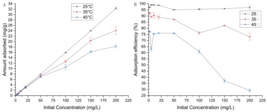Since eight concentration gradients were used in this experiment and the amount of phosphorus adsorbed increased as the initial concentration of phosphorus increased, the increase in phosphorus ions could have led the reaction towards adsorption until all the adsorption sites were filled. An increase in phosphorus in the solution further promoted the entry of phosphorus into the interlayer of the adsorbent. Consequently, the total amount of phosphorus adsorbed increased with increasing phosphorus ions in the solution (Figure 4A). However, the adsorption efficiency decreased with the increasing initial concentration of phosphorus, as with the continuing increase in phosphorus in solution, additional phosphorus would not be able to enter the adsorption sites that were already filled []. In particular, the adsorption efficiency was higher than 95% at 25 °C, suggesting that the adsorption efficiency was almost stable with the increasing concentration of phosphorus at 25 °C. However, the adsorption efficiencies decreased as the concentration of phosphorus in the solution increased in the cases of 35 °C and 45 °C (Figure 4B).