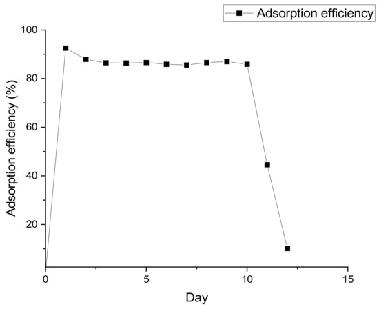 In Figure 6, the adsorption efficiency dropped rapidly after day 10 in the column experiment. The adsorption efficiency was about 85%, which was lower than the efficiency of batch adsorption, implying that the adsorption approached saturation within 10 days. The calculation reveals that the phosphorus adsorption capacity of Al13-O-MMt in column adsorption is 60 mg/g, which is higher compared to that of other montmorillonite-based sorbents (Table 1).