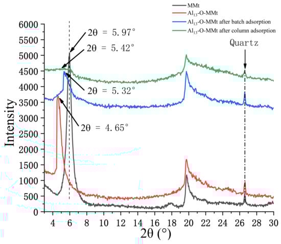 X-ray diffraction (XRD) was performed to further confirm phosphorus adsorption by analyzing the composition of Al13-O-MMt before and after batch and column adsorptions. The performance of Al13-O-MMt in adsorbing phosphorus could be identified through the changes between layers of Al13-O-MMt in the XRD patterns.