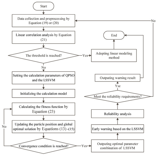 The normalized data and preset QPSO parameters were introduced into Equations (13)–(15) to initialize the optimization model of QPSO. Then, the normalized data and preset LSSVM calculation parameters were introduced into Equations (16)–(18) to initialize the LSSVM-based nonlinear early warning model. All the calculation programs were realized with the assistance of MATLAB 2016 software.