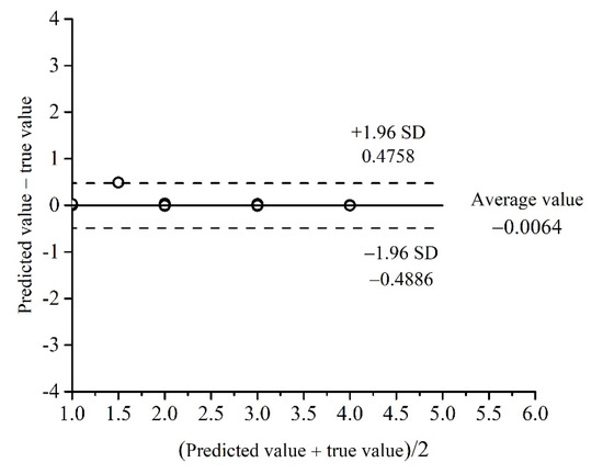 To testify the reliability of the predicted results in Section 5.3, the Bland–Altman analysis was used to analyze the predicted values and the measured values. The Bland–Altman analysis method was first put forward by British scholars Bland and Altman in 1983. Its basic principle is to analyze the differences between the results calculated by two different methods within a 95% confidence interval (consistency limit). This method has become an authoritative statistical method to judge the consistency of the results calculated by two data calculation methods. In this research, the calculation results based on QPSO-LSSVM and the real construction risks were compared. If the calculation results based on QPSO-LSSVM were consistent with the real construction risks within a 95% confidence interval, it showed that the risk warning results based on QPSO-LSSVM had good reliability. In the empirical study, the Bland–Altman diagram is shown in Figure 3.