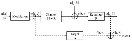 In Figure 2, we use the training data to collect signals a[j,k] and y[j,k] during the training process. We use equalizer F to match GPR target G, which is determined by the minimum mean square error (MMSE) algorithm during the training period. To implement the GPR target and equalizer, we require a buffer to process each data page [15]. We estimated parameters F and G in the training process. The forms of the matrices F and G are as follows: