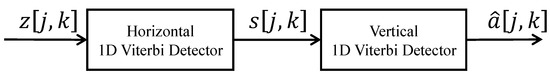 From (17), the signal z2way[j,k] can be directly detected by the 1D VA to achieve an estimation a2way[j,k]. We then use the signal a2way[j,k] to estimate the interference in (14) and remove it from (14). Similarly, we detect z4way[j,k] using a 1D VA to obtain the signal a4way[j,k]. Using the signal a4way[j,k], we can remove the interference from (6) and detect z[j,k]. Finally, we estimated the original a[j,k] with high accuracy and the best BER performance. In general, the signals a2way[j,k], a4way[j,k], and [j,k] are the estimated signals of the original signal with different accuracies. Among them, signal a2way[j,k] has the lowest accuracy, and signal [j,k] achieves the highest accuracy.