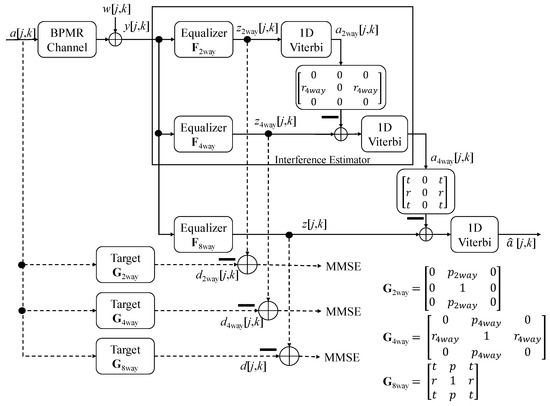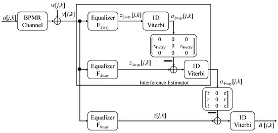 First, y[j,k] was fed to equalizer F2way and converted into signal z2way[j,k]. Signal z2way[j,k] was detected by a 1D VA and used to estimate the interference in z4way[j,k].