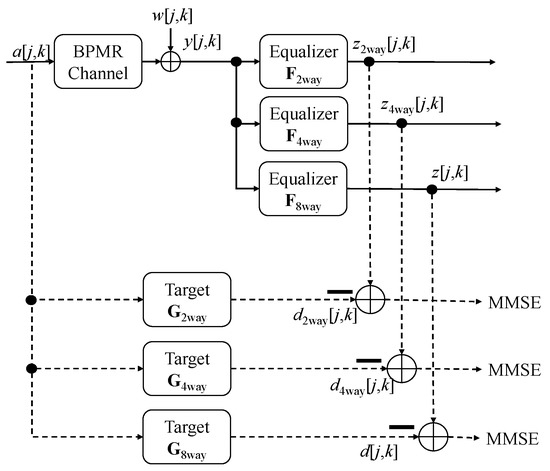 The model shown in Figure 7 was used for the training process. The model estimates the parameters of GPR targets and equalizers, as described in Section 2.1. We used training data to collect signals a[j,k] and y[j,k]. The Appendix A describes how we converted the signals a[j,k] and y[j,k] into vectors a and y, respectively. We calculated the parameters R, T, and A from a and y. Finally, using the conditions (A11), (A12), (A14), (A15), and (A17), (A18), and applying (A20)–(A22) in the Appendix A, we calculated the coefficients of the GPR targets G2way, G4way, and G8way and equalizers F2way, F4way, and F8way, respectively. The estimating of the equalizer and target is similar to training the coefficients of the equalizer and target. The parameters of the GPR target were then supplied to the estimator for interference and detection in the testing process.