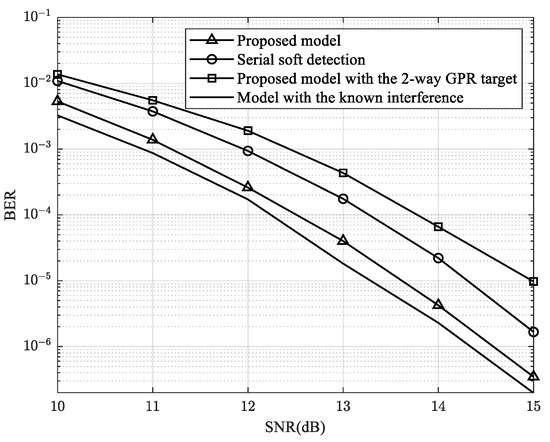 As can be seen in Table 4, the IRCSDFA is an iterative row–column soft decision feedback algorithm. This model uses the maximum a posterior (MAP) algorithm to design detection. When calculating the complexity of this algorithm, we simply computed for one iteration and a mask with a size of 3 × 3. Similarly, the IRSDF-Gaussian approximation (IRSDF-GA) is also an iterative row–column soft decision feedback algorithm, which applies a Gaussian approximation to reduce the complexity of the IRSDFA. When computing the complexity of the IRSDF-GA, we calculated for only one iteration. For the training process, we estimated three GPR targets in our proposed model. However, the calculation of the three GPR targets was performed simultaneously using different target constraints. Based on the multi-GPR targets in the testing process, the complexity was significantly reduced. By supplying the interference information for detection, we can convert 2D detection into 1D detection (via the VA). Designing the trellis of a 1D VA is simpler than that of 2D detection. The three detectors have similar structures and different output values. Therefore, with high performance, our proposed model can significantly reduce complexity.