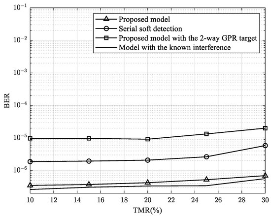 In the next simulation, we experimented with the BER performance while varying the level of the TMR from 10% to 30% at SNR = 15 dB. The results are shown in Figure 11.