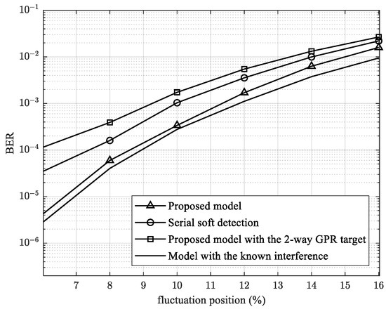 As shown in Figure 12, the proposed model obviously improves the performance compared to previous methods. The results indicate that the proposed model can achieve a gain of at least ~1.5 dB at a BER of 10−5. Finally, as shown in Figure 13, we varied the position fluctuation from 6% to 16% at 15 dB to observe the resistance of the proposed model to media noise.
