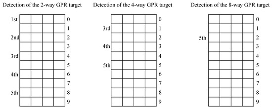 Figure 14 presents the tables of the data pages, and tracks are assigned from 0 to 9. First, we detected tracks 0 and 2 during the detection of the 2-way GPR target. Then, we can supply the interference information from tracks 0 and 2 for the detection of the 4-way GPR target, and we can detect track 1 in the detection of the 4-way GPR target. At the 3rd time, track 4 can be detected in the 2-way GPR target. Therefore, at the 4th time, we can detect track 3 in the 4-way GPR target. When we have tracks 1 and 3, we can detect track 2 in the 8-way GPR target at the 5th time.