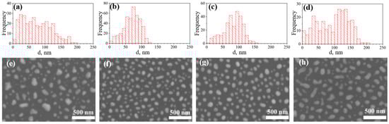 The diameter (d) distribution of AgNPs on the TiO2 surface and SEM images of AgNP/TiO2 structures obtained by SSD process (ta = 60 min, hAg = 10 nm) at different Ta: (a,e) 300 °C; (b,f) 350 °C; (c,g) 400 °C; (d,h) 450 °C.