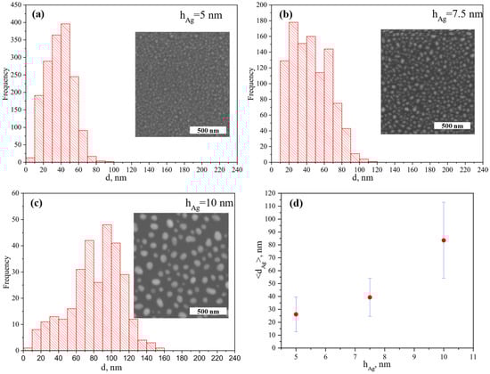 The diameter (d) distribution of AgNPs and SEM of AgNP/TiO2 structures obtained by SSD process (Ta = 400 °C, ta = 60 min) using different hAg: (a) 5 nm; (b) 7.5 nm; (c) 10 nm, and (d) the average NP diameter (d) dependence on hAg.
