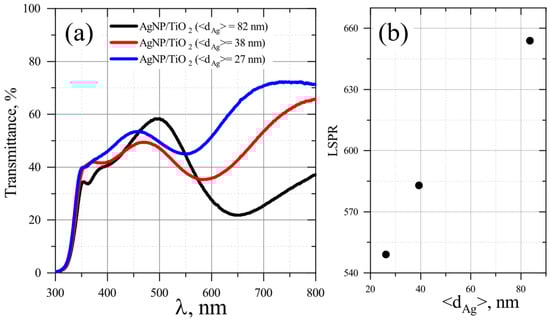 The LSPR effect can be observed in the transmittance spectra of AgNP/TiO2 structures (Figure 5). The transmittance of visible light reached minimum values in the 550–650 nm range. It can be seen that the LSPR effect increased with the size of AgNPs on the surface of TiO2 thin films.