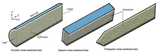 In terms of the adsorption beds used for carbon capture, the literature usually introduced beds with circular cross-sections for breakthrough studies [,] or separation processes [,,]. Circular beds with trapezoidal length beds were also investigated and showed no significant difference from the circular cross-sectional beds [].
