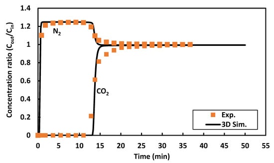 Breakthrough concentration ratio of CO2 and N2 at the bed outlet during the adsorption process using Mg-MOF-74 to compare the 3D simulation with the experimental data (at bed porosity = 0.674, particle size = 0.2 mm, bed length = 7 cm, bed diameter = 0.4 cm) []. Mg-MOF-74 is synthesized and characterized in the previous study [].