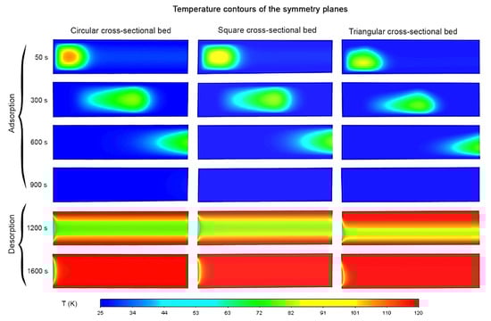 Temperature contours for the investigated beds at selective adsorption and desorption times.