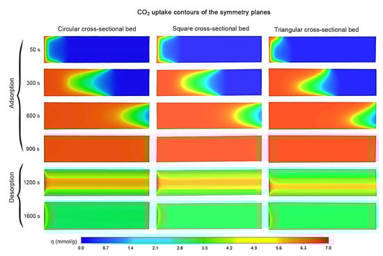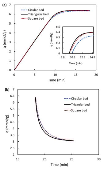 The adsorption uptake represents the ability of the bed to efficiently adsorb or desorb the desirable gas. A greater uptake shows that the bed capacity is high due to good cooling processes, and low uptake during the regeneration process indicates an efficient heating process. Of the three examined beds, the triangular one shows the greatest capacity during the adsorption process (Figure 6a) and the lowest capacity for an adequate desorption process time (Figure 6a). The square cross-sectional bed also has good uptake values. The difference between the three beds is not high (e.g., at t = 10.8 min, adsorption uptake is 6.04 mmol/g for the circular bed, 6.13 mmol/g for the square bed, and 6.17 mmol/g for the triangular bed); however, the square bed is best for large and industrial scales. In addition, for large scales, the triangular cross-sectional beds can be arranged compactly, compared to circular ones, which have cavities between beds. Figure 6 exhibits, in general, an increase in the adsorption uptake with time until the bed is saturated during the adsorption process, and the opposite occurs during the desorption process.