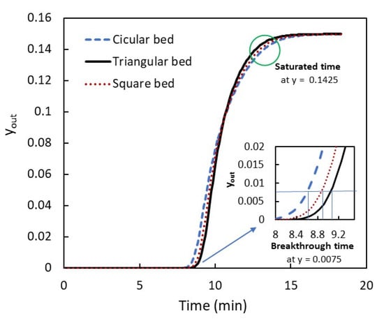 The adsorption concentration in terms of the CO2 molar fraction at bed exits is shown in Figure 5. As the inlet CO2 molar fraction is 0.15, the saturation conditions are reached when the CO2 outlet has 95% of the CO2 inlet (y = 0.1425). However, when the CO2 outlet reaches 5% of the CO2 inlet (y = 0.0075), this status is called the breakthrough point. The breakthrough point is for the CO2 separation applications to avoid the release of CO2 into the atmosphere. This means that, in real applications, the adsorption process should be stopped at the breakthrough point. It is obvious from Figure 5 that the triangular cross-sectional bed has a higher breakthrough time and lower saturation time, which are preferable. The higher breakthrough adsorption time means that the bed is able to adsorb more CO2, whereas a lower saturation time indicates a quick sorption process. The square cross-sectional bed comes second in terms of this advantage, while the circular one comes last. These results could be explained by the good cooling process during the adsorption process closer to the three corners of the triangular cross-section, which enables the bed to adsorb more CO2. The cooling process is better for the triangular bed than the square bed.