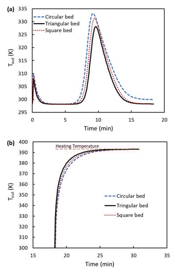 Temperature values increase in the bed during the adsorption process due to the exothermic phenomenon of the adsorption. An increment in bed temperature has a negative impact on the adsorption capacity, so a bed design that can minimize increases in temperature values is desirable. Figure 7a shows that the outlet temperature of the triangular cross-sectional bed has the lowest temperature values. Its maximum temperature (during the adsorption process) is about 327 K, which is lower than that of the circular bed by 6 K. Figure 7b also emphasizes the merits of the triangular bed in reaching higher temperatures quickly during the desorption process. The triangular cross-section has three corners that raise the bed temperature closer to the surfaces than the core. The core of the circular cross-sectional bed is wider, so the heating process takes time since the thermal conductivity of adsorbent materials is very low (~0.3 W/m·K).