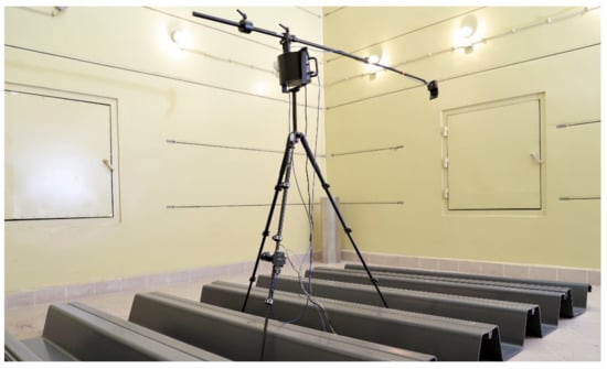 The second phase of the test considered the examination of the absorption coefficient of studied PVC panels. For every test, around 10 m2 of the panel were placed on the floor of the reverberation chamber according to standard ISO 354:2005-Acoustics—Measurement of sound absorption in a reverberation room. Interlocking connections allowed us to build off the PVC sheet of approximately 5 m in width. Before testing, panels were inserted into the reverberation room for 24 h to acclimatize to the atmospheric conditions in the chamber, see Figure 4. Measurements were conducted using a rotating microphone boom Nor265 with an integration time of 30 s for each microphone position. The 1/3 octave bands were measured using Nor140. The microphone was calibrated before the acoustic test.