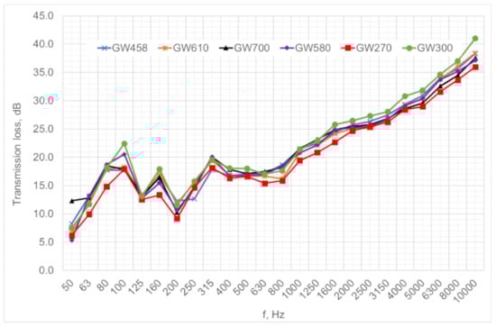 Figure 5 show the measured TL values for the studied fluted PVC panels. For studied panels, the transmission loss is influenced by four factors: size, stiffness, mass, and damping. In Figure 5, similar TL spectrums are observed. In the low and medium frequencies, the three visible peaks are observed: around 100 Hz, 160 Hz, and 315 Hz, and dip at 125 Hz and 200 Hz. These dips can be interpreted as a specific vibrational mode of the panel or the lowest acoustic coincidence of the panels. At low frequencies, the transmission depends heavily on stiffness, as can be observed for GW700 panels under 63 Hz. With greater bending stiffness and a shorter span, the transmission loss is the highest. However, the measured transmission loss of all fluted panels indicates no distinct lower critical frequency shift with the change of panel shape. The low-frequency response of panels of different depths is similar.