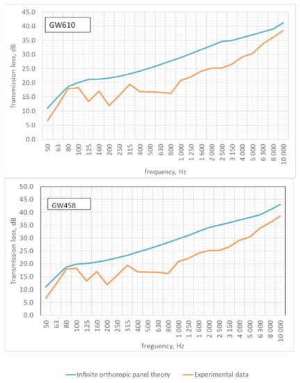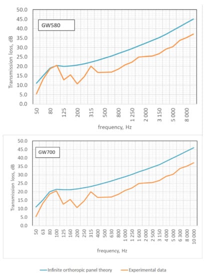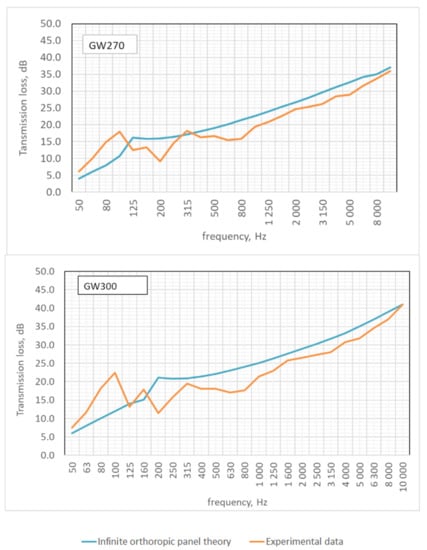 Calculated panel properties allowed for a comparison of the theoretical values and measurement result, as shown in Figure 6, Figure 7 and Figure 8, and values are given in Table 3, Table 4, Table 5 and Table 6. The results show that Hansen’s scheme provides a reasonable TL prediction in agreement with measured results for studied GW270 and GW300, which could be connected with the good results of Hansen’s theoretical model for thin panels. For the rest of the panels, the predictions differ from the measurement overestimating at higher frequencies. There are also differences between theory and experiment at low frequencies. The first resonance frequency of the studied panels varies from 80 Hz to 230 Hz. As this theory only applies to frequencies well above the first resonance frequency of the panel, some discrepancies are expected. However, this approach that was developed by Hansen cannot account for localised vibration effects, as can be seen in Figure 5, Figure 6, Figure 7 and Figure 8. The following behaviour, such as the resonance of corrugated or fluted panels, is to be especially noted. A stiff construction moves the first resonance to higher frequencies but the frequency of coincidence moves to lower frequencies. Thus, the extent of the mass law region depends on the stiffness of the panel.
