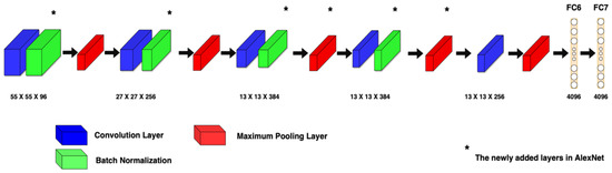 A modified AlexNet model architecture is introduced, named Mod_AlexNet. The proposed architecture modified the existing AlexNet architecture, aiming to improve the classification performance of the standard AlexNet. The proposed Mod_AlexNet architecture is shown in Figure 4 and the added layers are highlighted.
