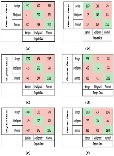 Samples of colour mapping (a) original normal image, (b) colour mapped normal image, (c) original benign image, (d) colour mapped benign image, (e) original malignant image, (f) colour mapped malignant image.