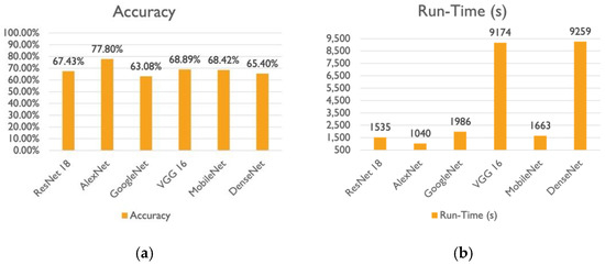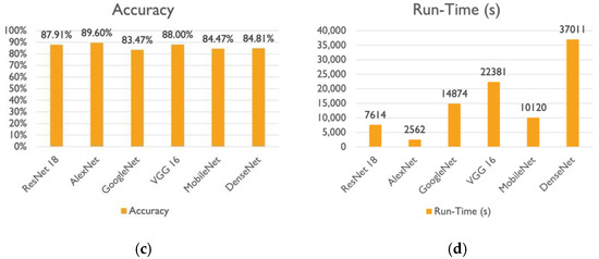 Table S8 and Figure 7c,d compare the accuracy and run-time (s) of the DL models on Dataset 3, respectively. According to Table S8 and Figure 7c,d, AlexNet recorded the highest classification accuracy of 89.6%, while GoogleNet recorded the lowest classification accuracy of 83.47%, and VGG-16 and ResNet-18 both achieved an 88% classification accuracy, but VGG-16 took nearly three times as long as ResNet-18 to achieve it. Finally, DenseNet-201 achieved the same accuracy as MobileNetV2 at 85%, but it took three times as long.