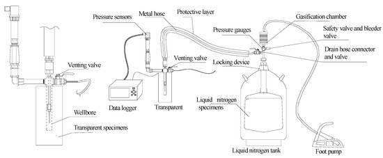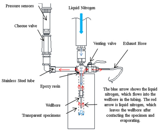 Figure 2 is a schematic of the liquid nitrogen low-pressure impact experiment. In this experiment, liquid nitrogen was extracted from the liquid nitrogen storage tank with a liquid nitrogen extraction device, and the pressure difference was obtained with a pedal cylinder. Meanwhile, the vent valve was closed, and the valve of the hose connection was opened. With the increase in pressure, liquid nitrogen was transported to the specimen through the insulating layer sleeve hose, injected into the borehole, and directed to the outlet. Figure 3 shows the flow path after the liquid nitrogen injection. The blue arrow denotes the liquid nitrogen that flows into the wellbore in the tube. The red arrow is the nitrogen that leaves the wellbore after the liquid nitrogen contact sample is evaporated. The figure demonstrates that liquid nitrogen makes contact with the sample at room temperature to absorb a large amount of heat, and gradually vaporizes into nitrogen. At the beginning of the test, the liquid nitrogen in the injection well was mainly nitrogen. The liquid–gas mixture was gradually transformed into the wellbore. Furthermore, epoxy resin was used as a sealing treatment between the sample and the metal device to ensure a smooth flow path. After injection, nitrogen flowed into the interface and opened the vent valve. Accordingly, nitrogen flowed into the outdoors from the exhaust hose to avoid indoor asphyxiation due to the discharge of large amounts of nitrogen.