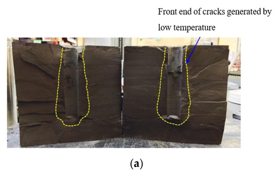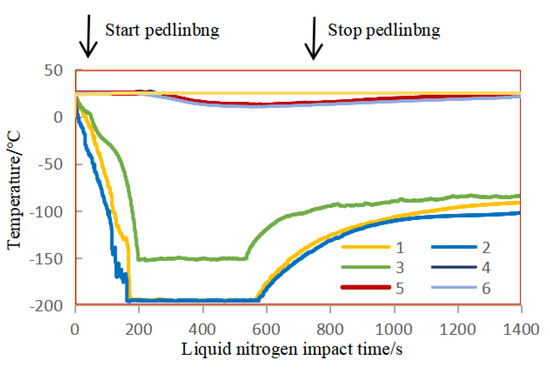 Figure 6 shows Cha et al.’s [16] unconfined low-pressure (about 0.01 MPa) liquid nitrogen test of the tight sandstone samples and the measured sample temperature change diagram. The temperature change was similar to the temperature change of the acrylic specimen shown in Figure 5, and the initiation and propagation of the specimen crack were related to the temperature change and distribution of the internal and surface of the specimen. During the test, liquid nitrogen further flowed into the crack, making the crack expand again, which accelerated the temperature propagation. In this regard, similar transparent materials can be used instead of shale to study the fracture mode under low-temperature freeze-cracking.